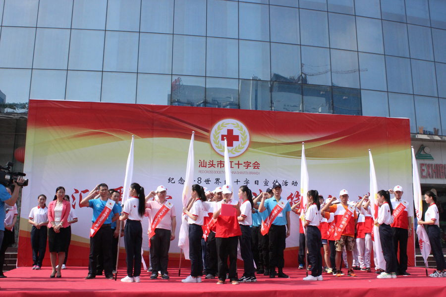 In the morning of May 6th, in memory of the 69th Red Cross day, Shantou Red Cross held a series of commemorate activities in the North Square of Lin Baixin Exhibition Center to carry forward the spirit of the Red Cross: "Humanity, Fraternity and Dedication". The presented guests were Zhao Hong (赵红), the vice mayor and the president of the Shantou Red Cross, Zheng Yanping (郑衍平), director of Shantou Health and Family Planning Department, and Huang Shaobin (黄少斌), the vice director of Shantou University Organization and Publicity Department. Xu Qiuyuan (许秋源) and Lin Huanhuan (林欢欢) from Shantou TV station were invited to be the hosts in this activity.